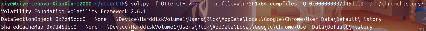 vol.py -f OtterCTF.vmem --profile=Win7SP1x64 dumpfiles -Q 0x000000007d45dcc0 -D ./chromehistory/