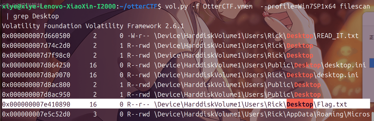 vol.py -f OtterCTF.vmem --profile=Win7SP1x64 filescan | grep Desktop